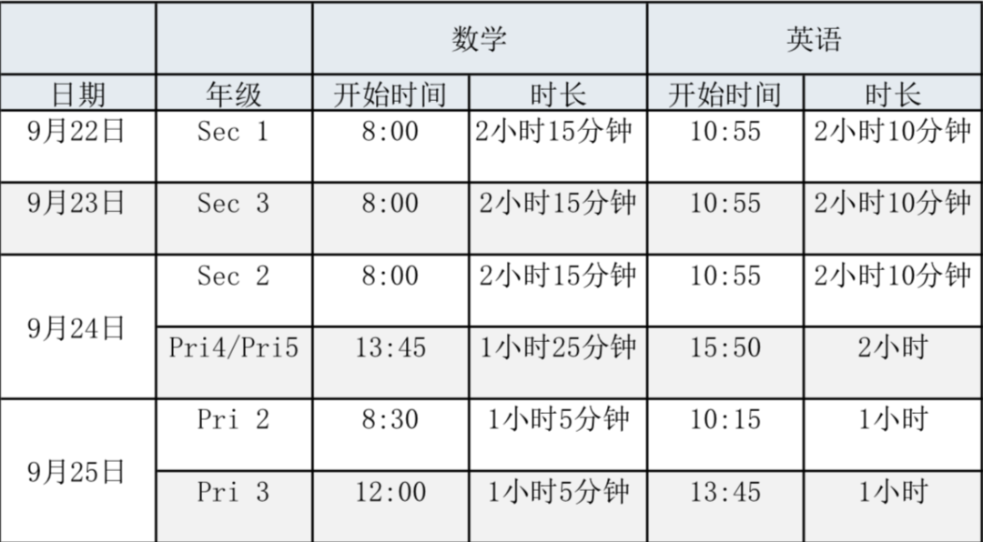 要注意,今年九月的考试时间安排和以往略有不同,之前每个年级都是上午先考数学、午餐休息后接着考英语,而这次则是半天时间全部考完。具体考试时间安排如下: